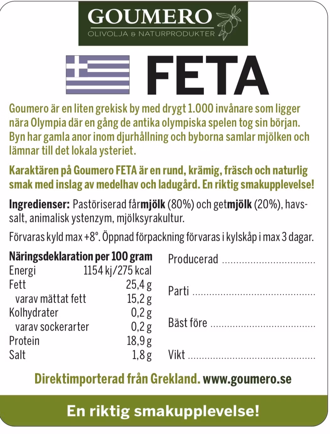 Vår fetaost är producerad i byn Goumero av 80% fårmjölk och 20% getmjölk. Djuren betar fria bland olivlundarna. God att äta som den är, i sallad och matlagning.